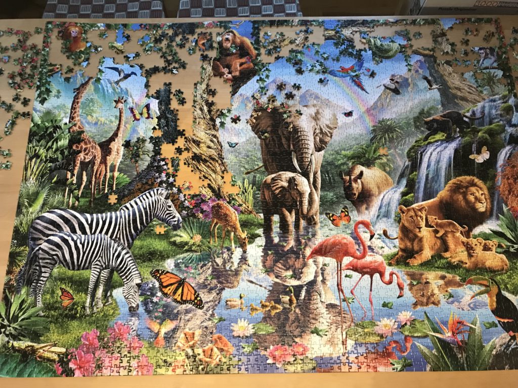 Nu när jag klarat av hela helgen utan matbordet, så är det ju ingen brådska att få klart pusslet. Det är inte många bitar kvar, men det är den allra svåraste delen!