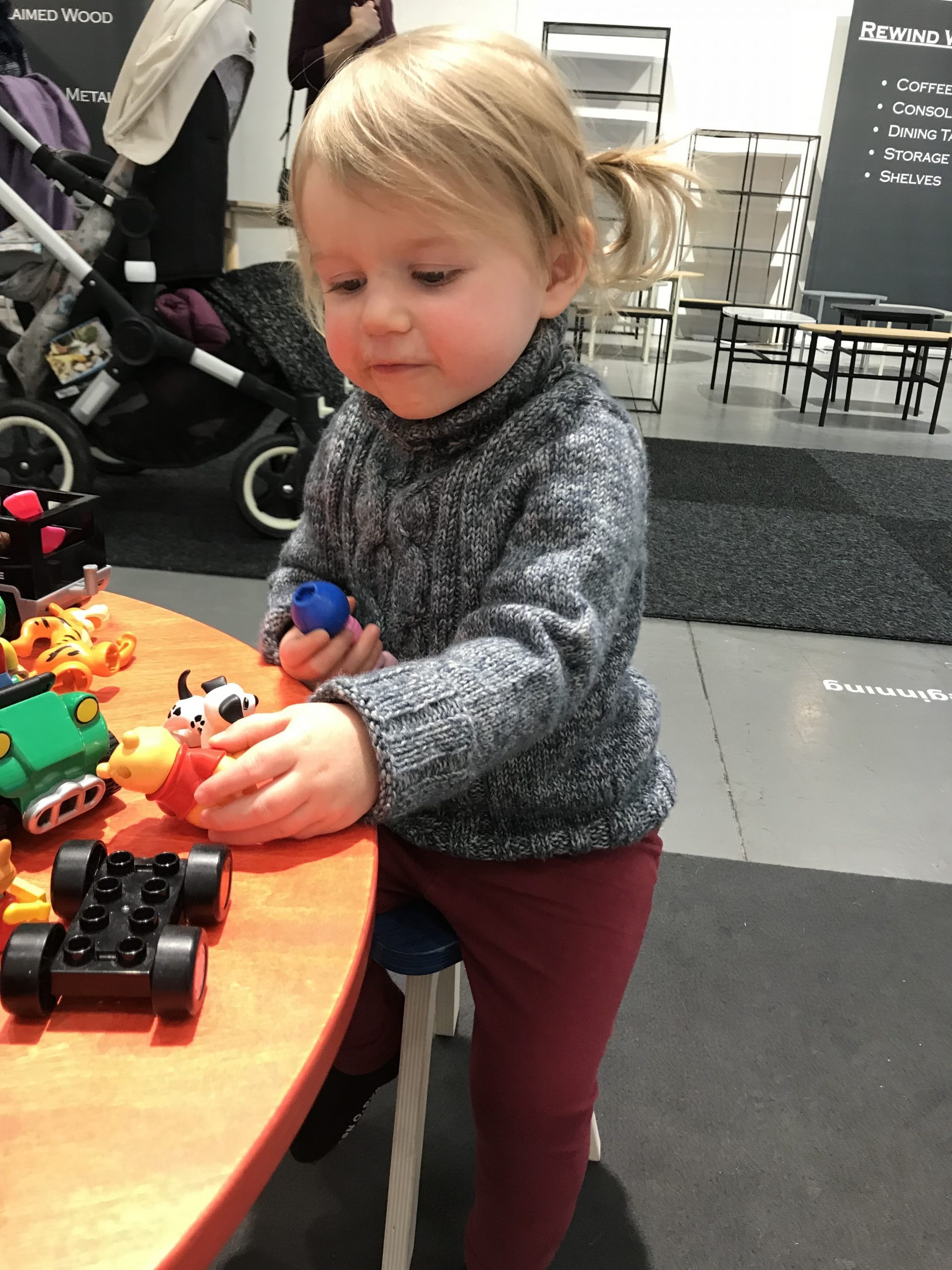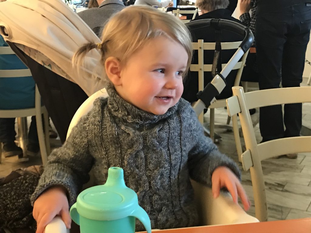 Vid halv 2 tog vi en matpaus. Då hade Ella fortfarande inte sovit något. Förutom att hon vid ett stånd absolut vägrade gå vidare (till kvinnan i monterns stora förlägenhet), så skötte hon sig exemplariskt!