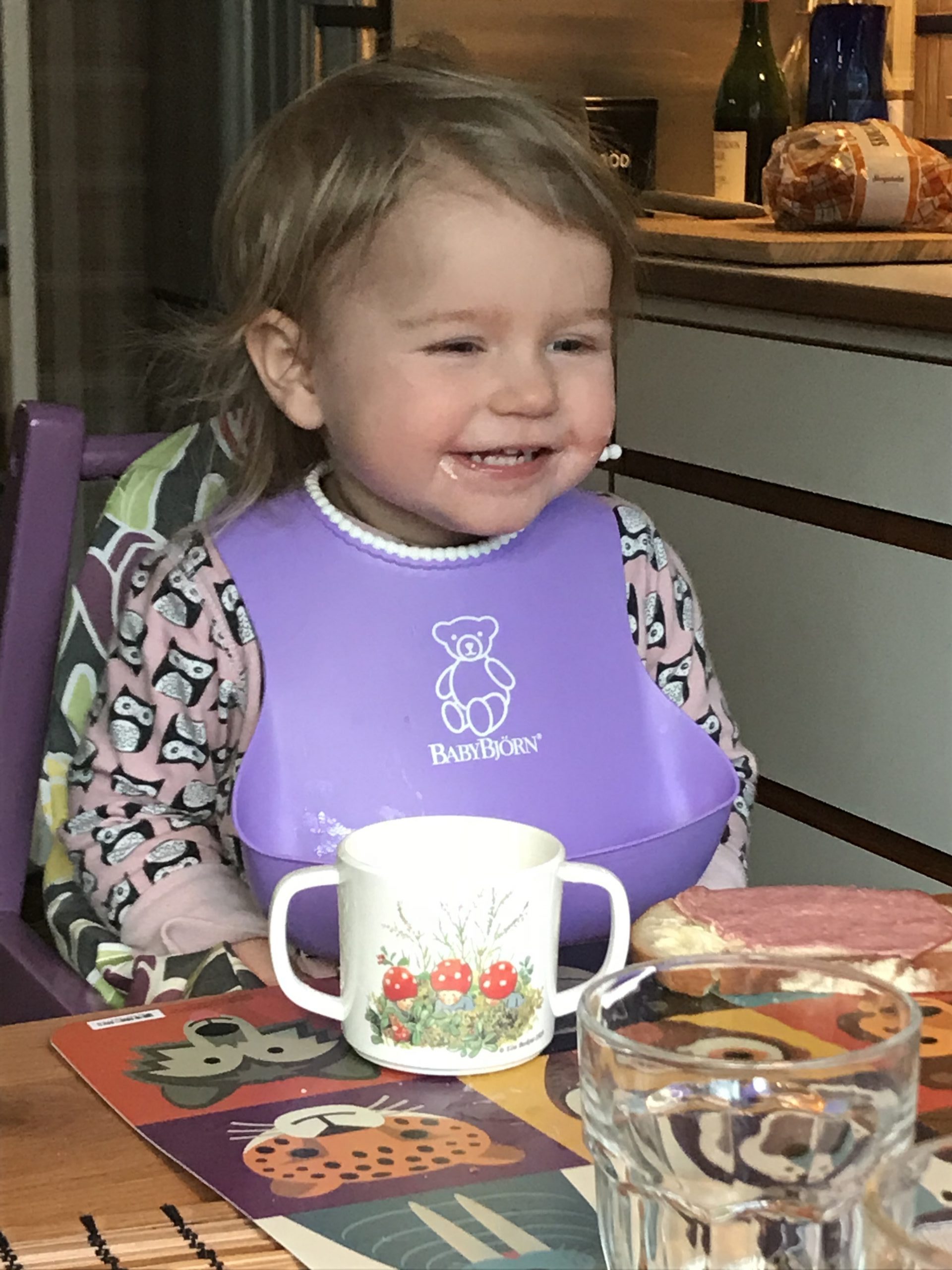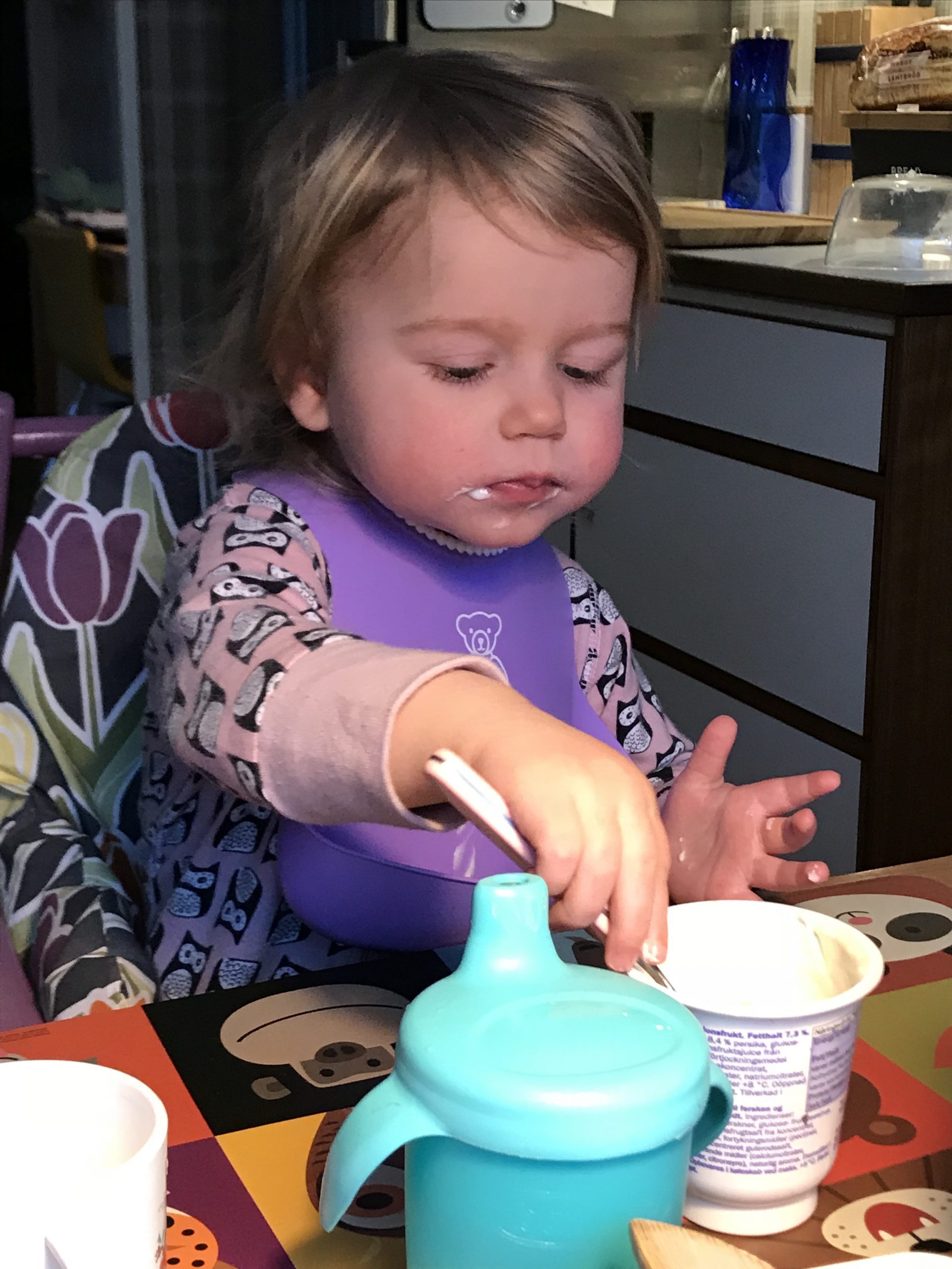 Nästa morgon hamnade nästan all yoghurten i munnen! Träning ger färdighet.