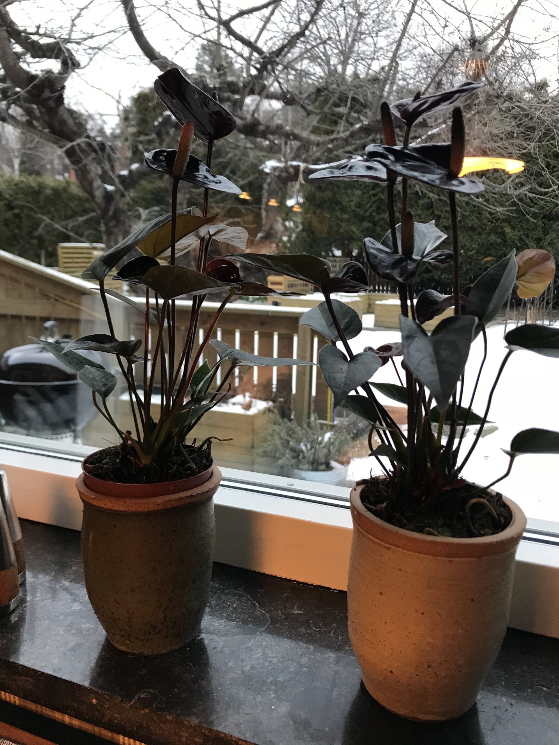 Och ställer fram nya krukväxter i köksfönstret. Min suckulent som jag haft i flera år började helt plötsligt att ruttna, och den lilla minigranen som vi hade i julas barrade som bara den, och åkte ut i uterummet (för den skjuter en massa skott samtidigt). Men de här två svarta rosenkallorna är ju häftiga! Även om hemgjorda krukor inte alltid blir lika stora…