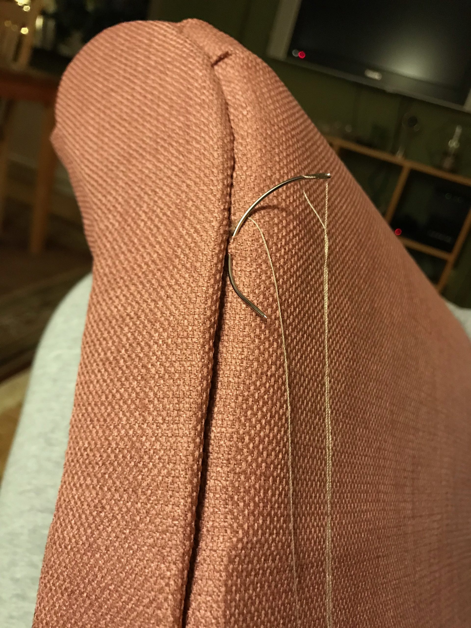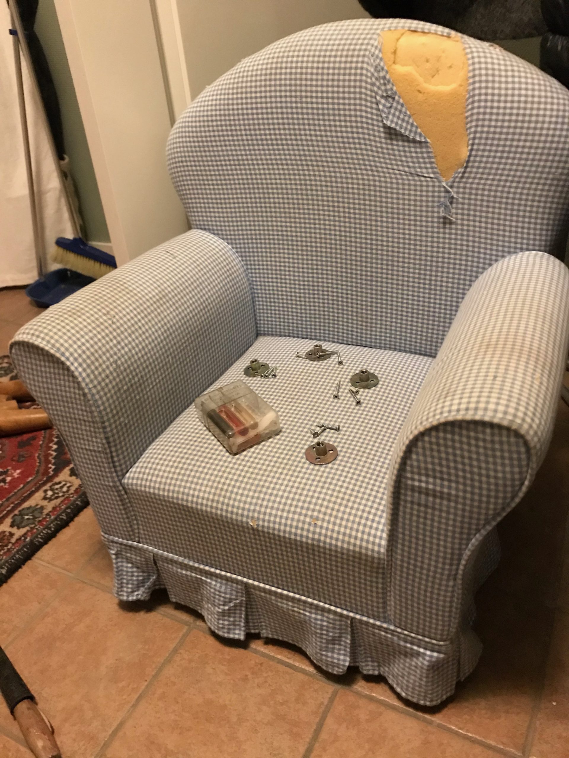 Vi började med sitsen men sedan så blev det inte så mycket mer gjort eftersom jag fick influensa men sedan fick vi i hop fåtöljen lite till innan det var dags för Sven att få vinterkräksjuka och jag följde efter en vecka senare. Men igår kväll så blev den äntligen färdig.