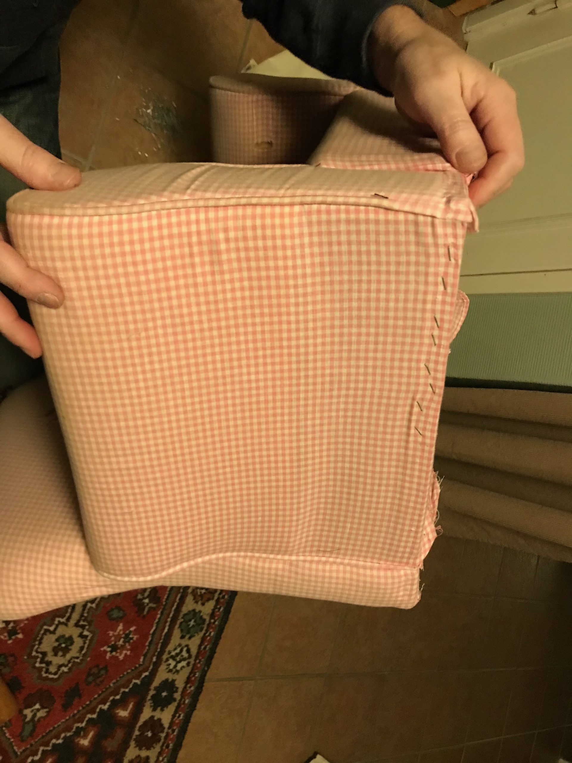 De hade båda något slags fodral i något tyg från slutet av förra seklet, som man tog bort med hjälp av en dragkedja i ryggen. När man tog av det så såg vi att det var en rosa och en blå fåtölj. Tyget man hade valt var kanske inte det bästa för att klä en möbel och det syntes ju också på tyget och alla revorna.