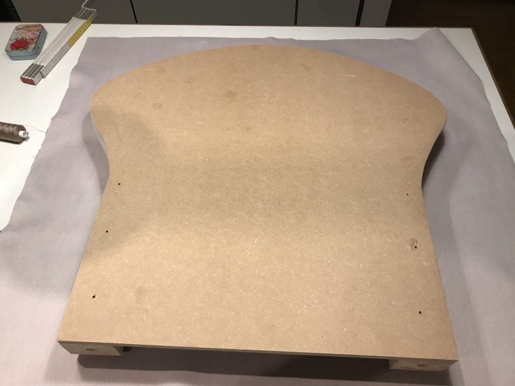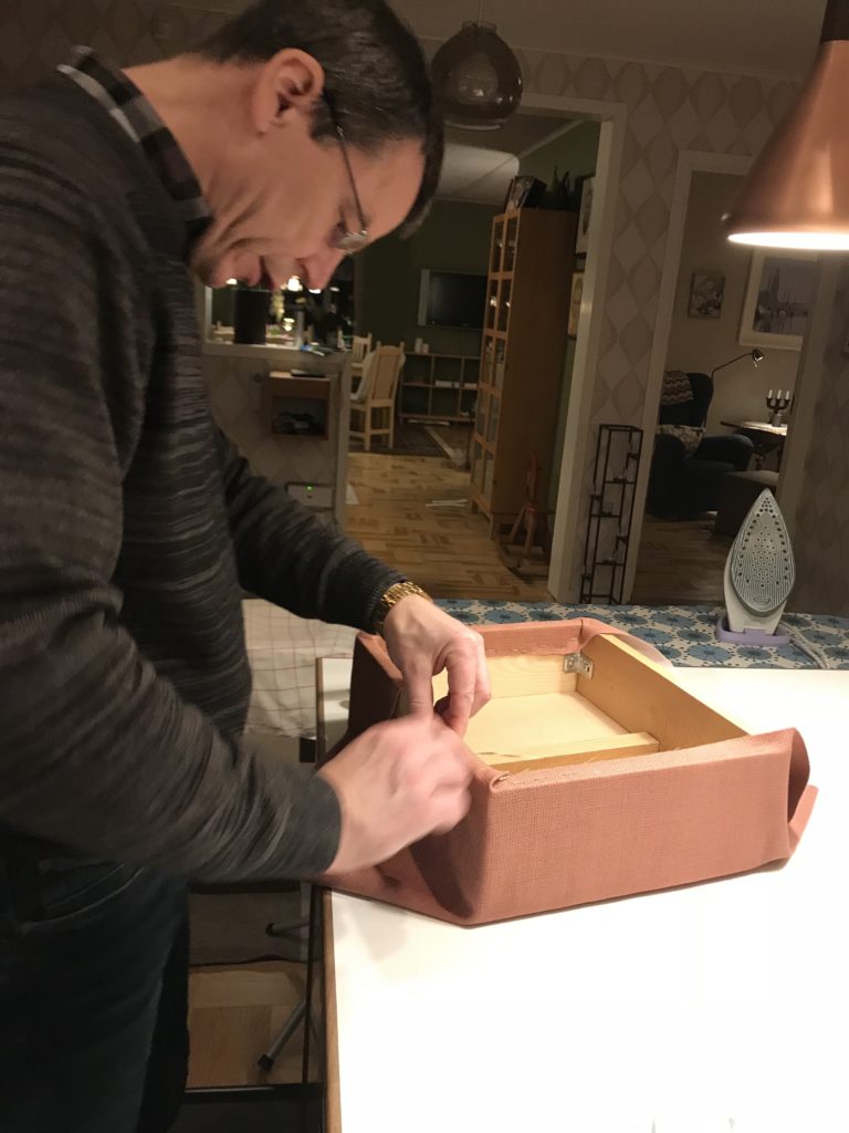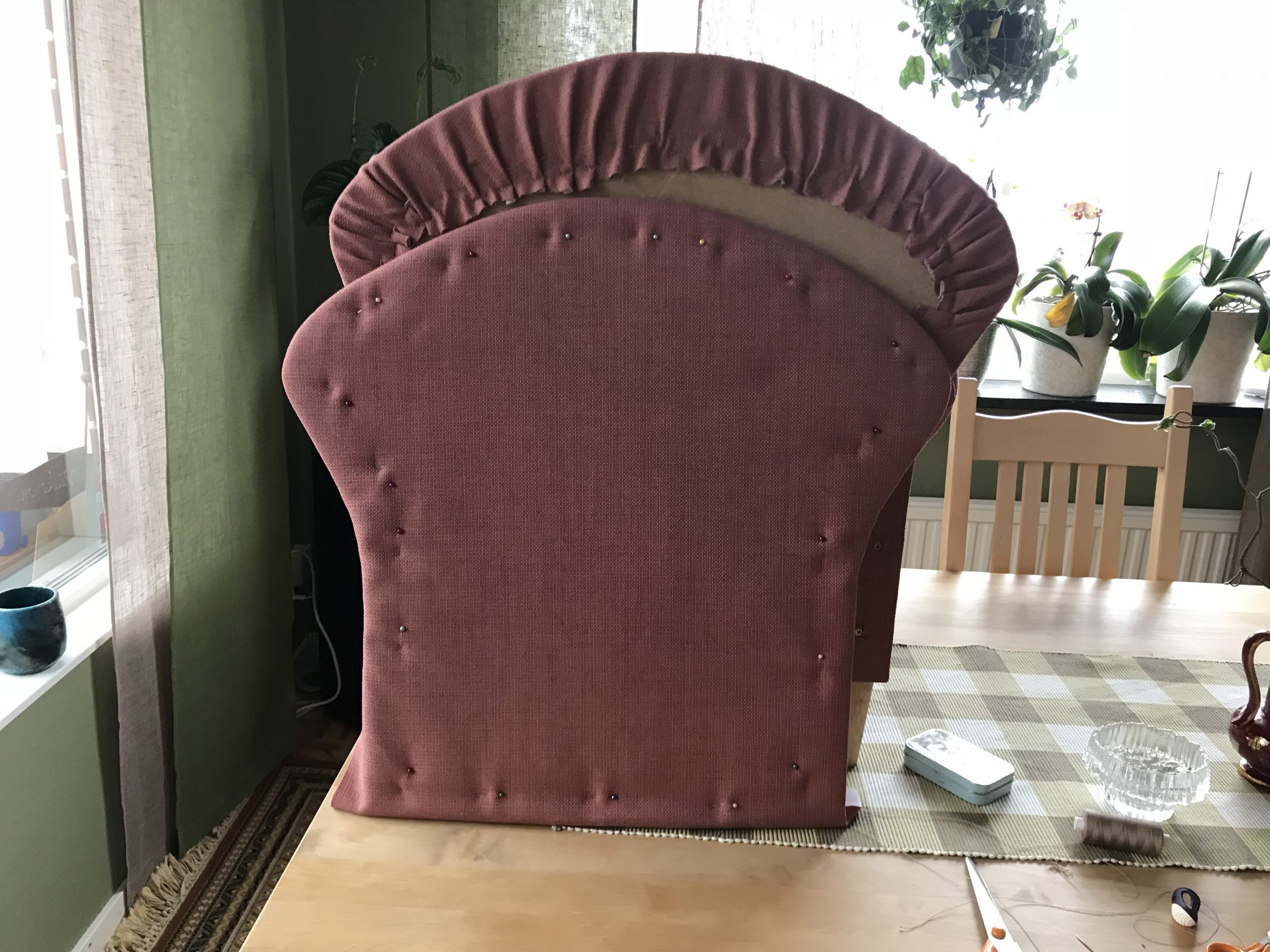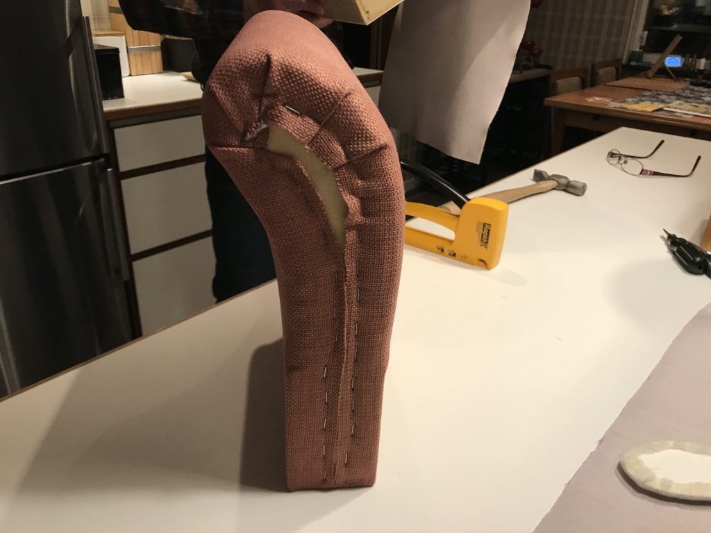 Men nu kunde vi i alla fall göra klart det sista, som var att klä armstöden med kartong och framsidorna på armstöden och ryggen skulle ha en vadderad tygklädd bit som skulle sys fast. Det gällde att tänka både en och två gånger i vilken ordning allt skulle göras.