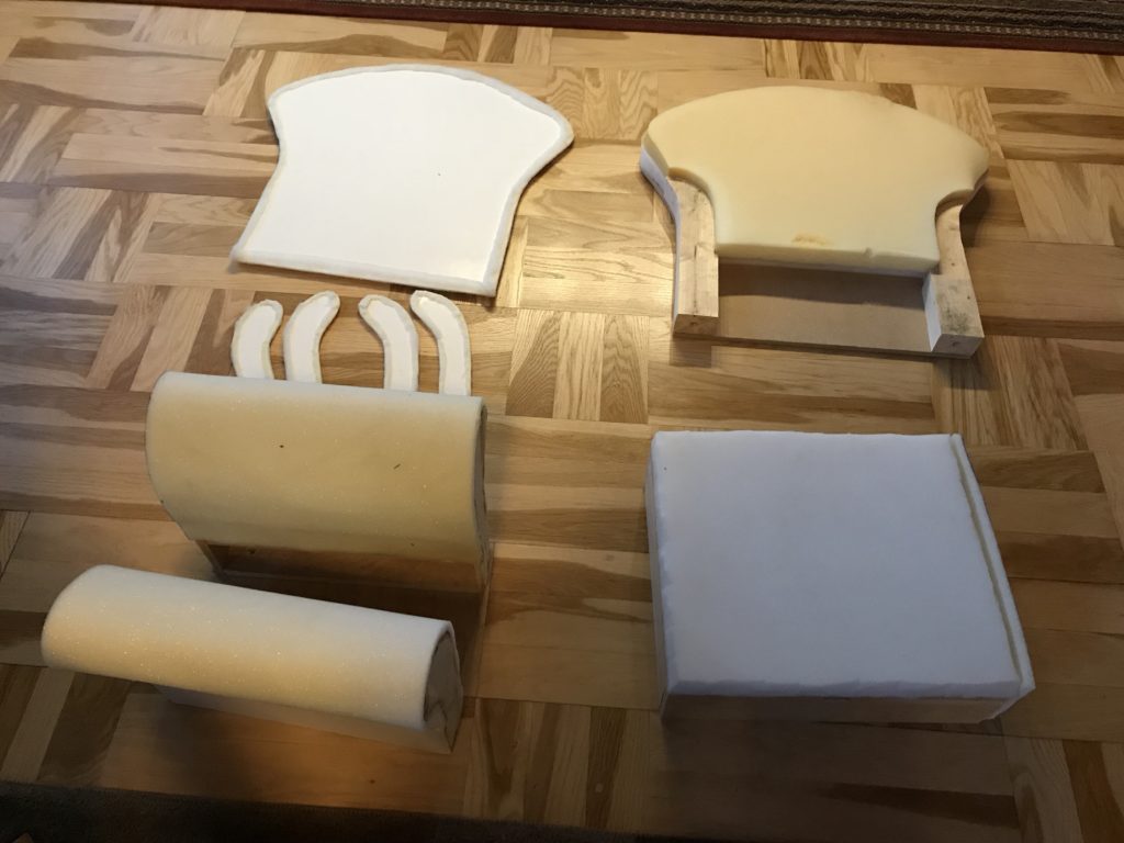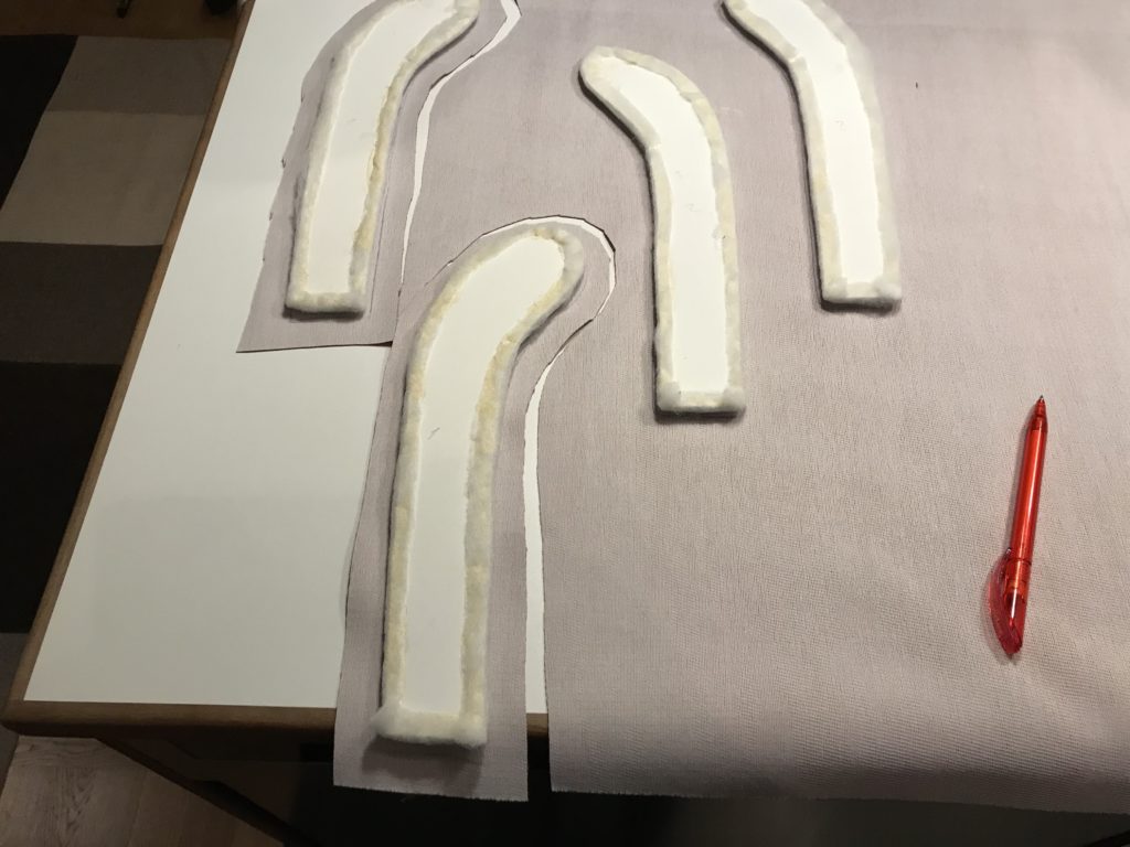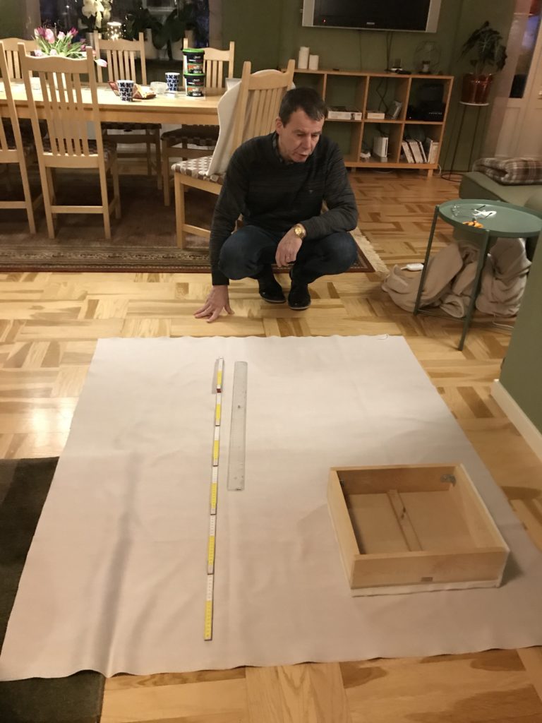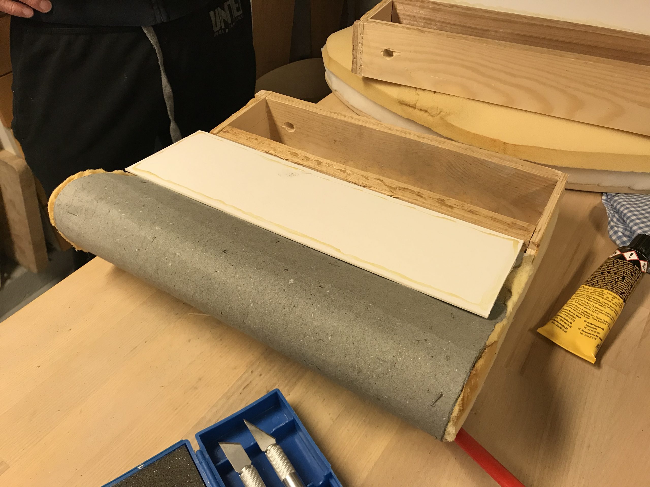 Men nu kunde vi i alla fall göra klart det sista, som var att klä armstöden med kartong och framsidorna på armstöden och ryggen skulle ha en vadderad tygklädd bit som skulle sys fast. Det gällde att tänka både en och två gånger i vilken ordning allt skulle göras.