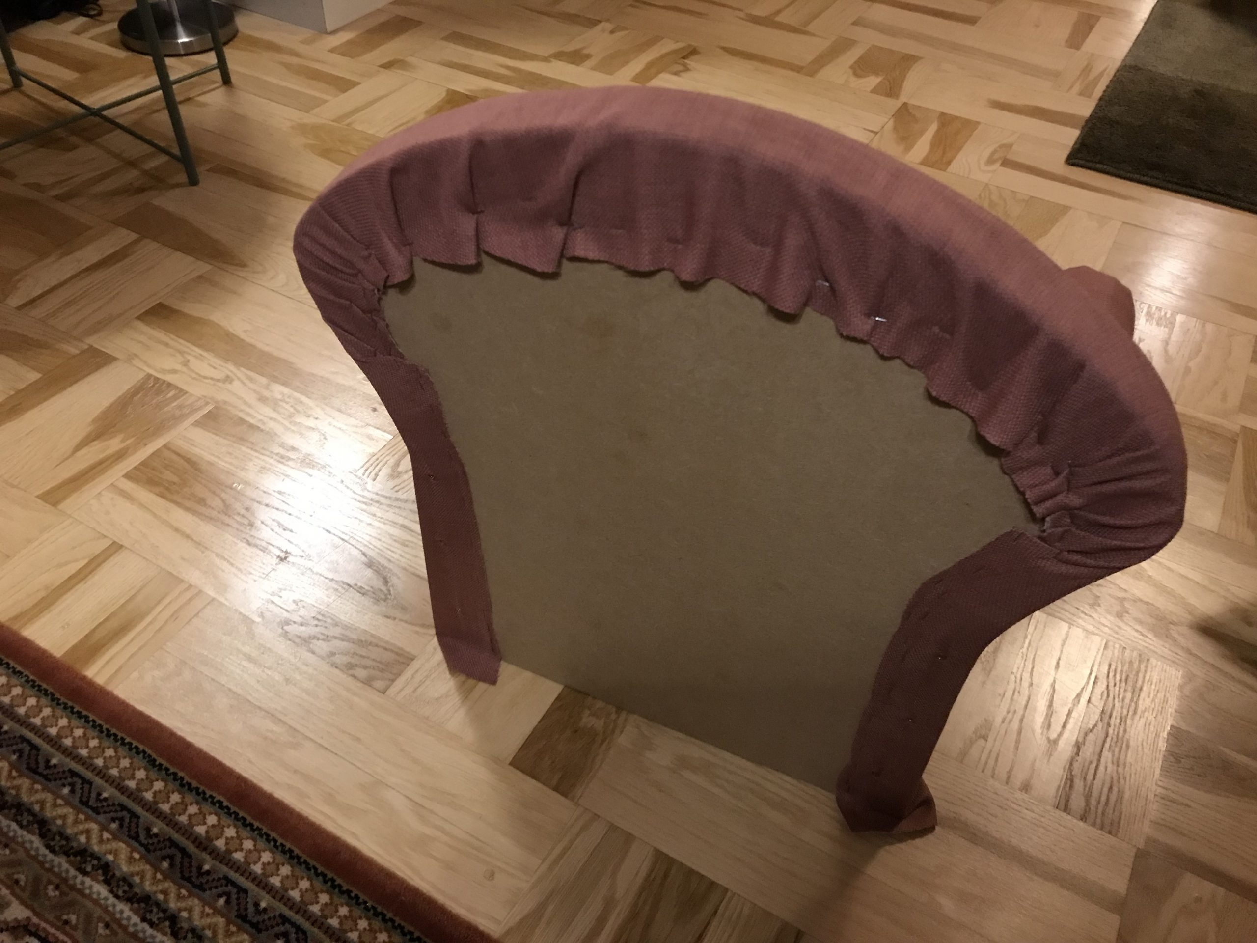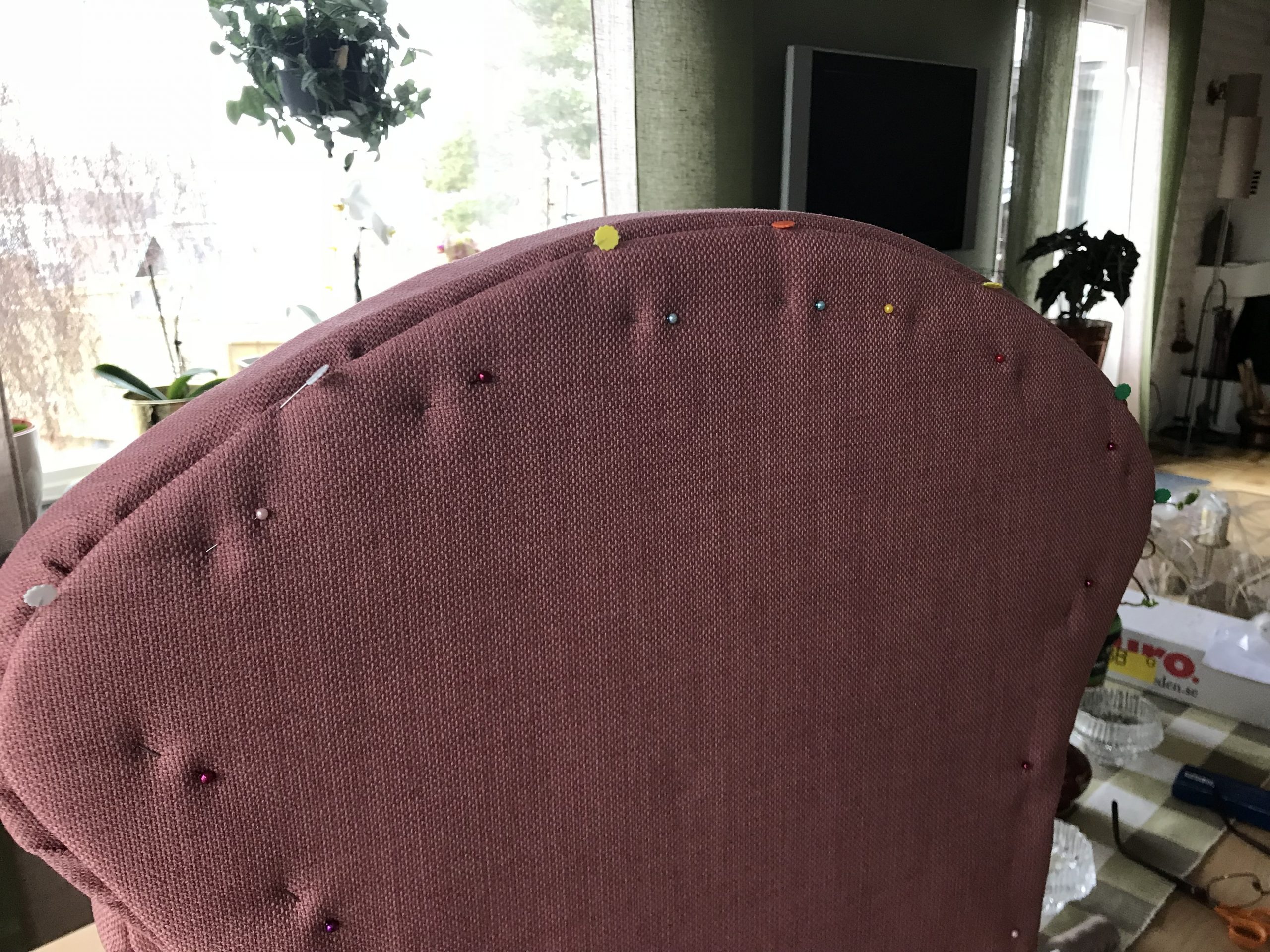 Eftersom vi skulle ge den till Ella, så vågade vi inte oss på några extravaganser när det gällde mönster på fåtöljen. Ella har föräldrar med väldigt strikt smak, och enfärgat är bäst. Så en potatis-rosa färg fick det bli i ett möbeltyg från Stoff och Stil.