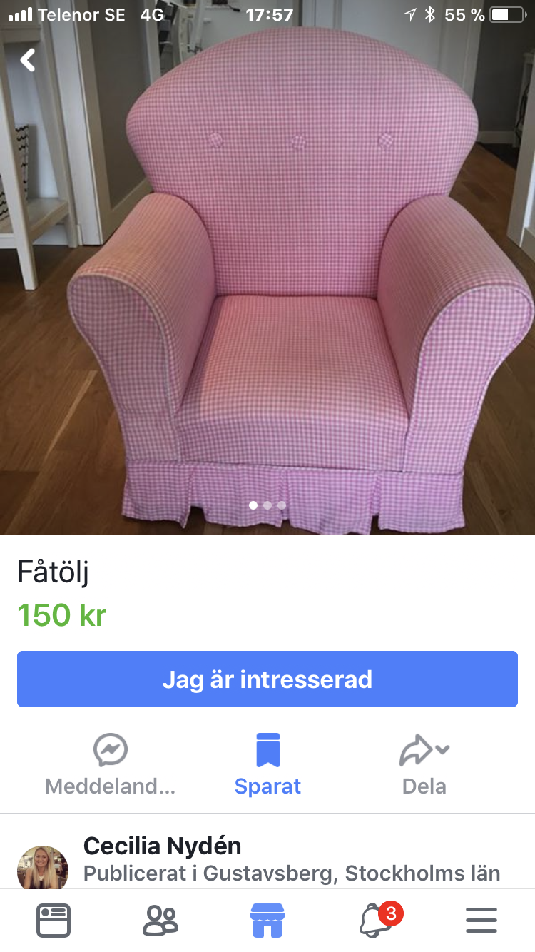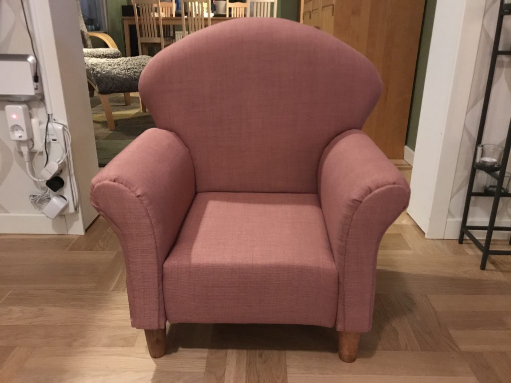 Det roliga var att jag har en sökning på Facebook på fåtöljer för jag letar efter en vuxenfåtölj till vardagsrummen och en dag fick jag se den här annonsen. Jag skrev till personen och frågade om det fanns någon historia bakom fåtöljen och berättade om mina. Men det var tydligen inte så intressant att svara för jag har inte hört något sedan dess.